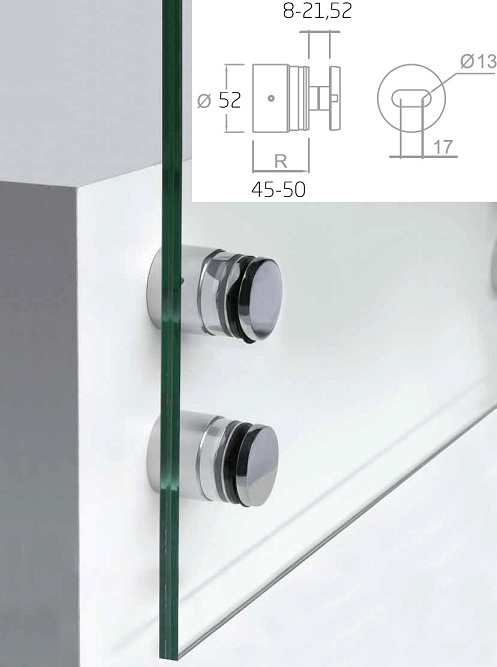 - Botón 208 sujeta escalón a pared de barandilla de vidrio. Adaptador lateral de vidrio para sujetar escalones de vidrio a barandilla de vidrio o también a pared de hormigón. Permite esconder el taladro dentro escalón, permitiendo una visión esclusivamente de vidrio.
