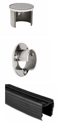 | perfil superior RP1400 de Acero INOX 304, redondo de 42,4 mm de diametro para vidrios desde 8 a 21,52 mm sujetado con goma. | Perfil superior SV1250 Alumnio Anodizado, rectangular sujetado con cinta doble cara y en 3 tamaños para 3 grosores de vidrio : 12, 16 y 20 mm | |