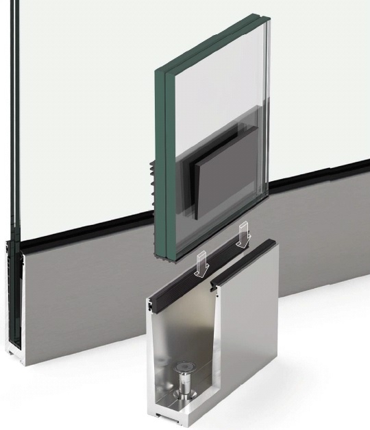 - El vidrio no necesita ser mecanizado, se sujeta mediante cuñas, por tanto es suficiente con un vidrio laminado LAMICID 6+6.2 8+8.2 o 10+10.2, aunque puede ser necesario que sean vidrios templados SECURCID, dependiendo de la carga a soportar y del espesor elegido. Para reducir el espesor de vidrio, y conseguir una mayor estabilidad estructural, es requerido para fabricar el vidrio laminado el uso del intercalario SENTRYGLAS, que permite una resistencia mucho mayor a espesores menores.