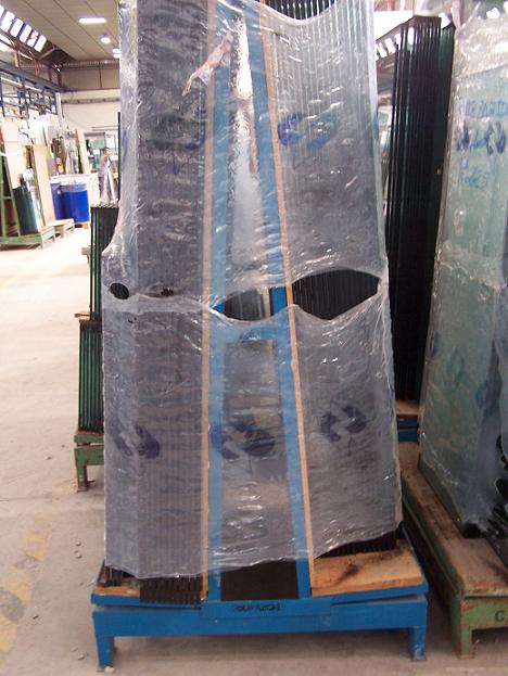 - Los volúmenes con la misma dimensión o formato irán apoyados unos contra otros, siempre que las cargas queden soportadas por perfiles separadores. Si, por el contrario, las dos dimensiones del volumen son menores que las del vidrio de apoyo, se utilizan separadores de madera con el fin de repartir uniformemente las cargas.
