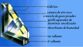 CLIMAGLAS es un doble acristalamiento Aislante Térmico, compuesto por dos o más vidrios de perfecta planimetría y calidad óptica, separados entre sí por perfiles de aluminio anodizado, rellenos de una sustancia absorbente de humedad del aire contenido en la cámara estanca formada por los vidrios. Los dos vidrio van unidos al perfil separador por sendos cordones de butilo que constituyen la primera barrera de estanqueidad. La segunda barrera, sellante, es un relleno de polisulfuro inyectado a presión entre el borde exterior del marco separador y los dos bordes de los vidrios.