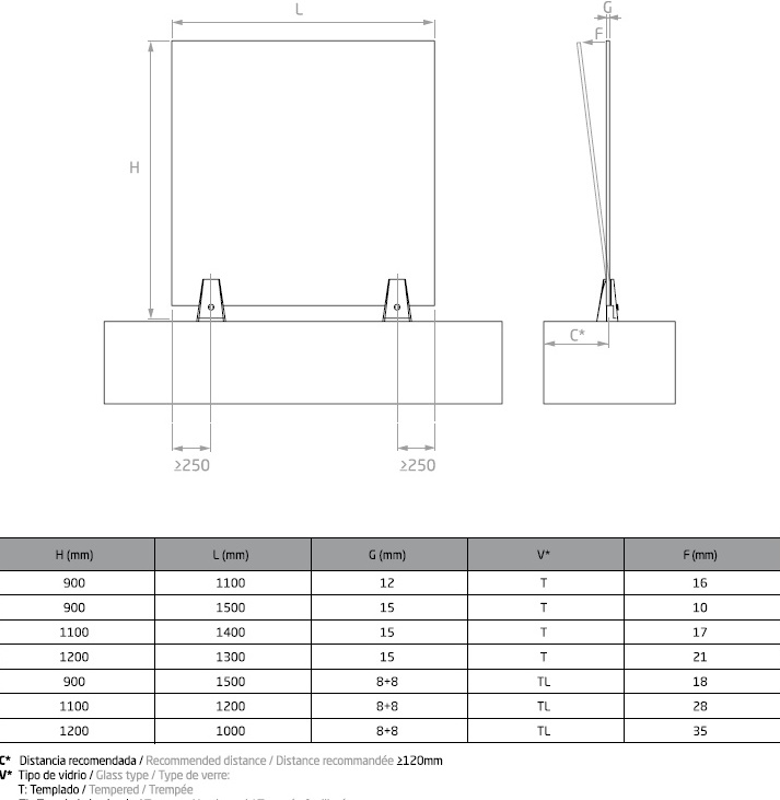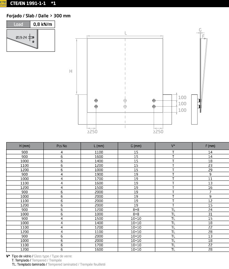 - Los vidrios deben ser mecanizados mediante taladros de 19 a 24 mm de grosor , pero deberán ser obligatoriamente o vidrio templado SECURCID de 15 o 19 mm, o también vidrio templado laminado LAMICID 8+8.4 mm o 10+10.4 o vidrio templado laminado SENTRYGLAS 6+6.4 o 8+8.4 o 10+10.4