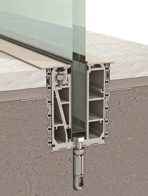 - Barandillas de vidrio sujetadas mediante Perfil de suelo montaje superior. Se trata de un perfil de aluminio, o también de acero inoxidable 304 (para interiores) o 316 (para exteriores). La calidad del hormigón debe ser comprimido y traccionado. Existen varias versiones, dependiendo de su resistencia que deba soportar la barandilla de vidrio a una carga de presión horinzontal. Disponemos de las siguientes series: